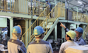 大日精化グループでは、拠点ごとに設置されている安全衛生委員会を全社的な位置から俯瞰し、相互連携して機能を高めるために、生産機構担当役員が委員長を務める全社安全衛生委員会を設置しています。この全社安全衛生委員会では、さまざまな知見を持った委員で生産現場のパトロールを行い、不安全作業や設備的な問題点を指摘し、未然に災害を防止する取り組みを行っています。2025年3月期はこのパトロールを10事業所で行いました。